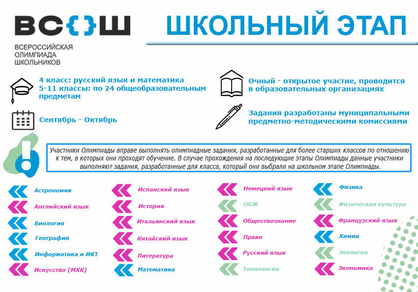 Школьный этап – первый, самый массовый из этапов всероссийской олимпиады школьников, ежегодно в нём принимают участие более 6 млн. человек. Школьный этап олимпиады проводится по заданиям, разработанным для 5-11 классов (по русскому языку и математике - для 4-11 классов).