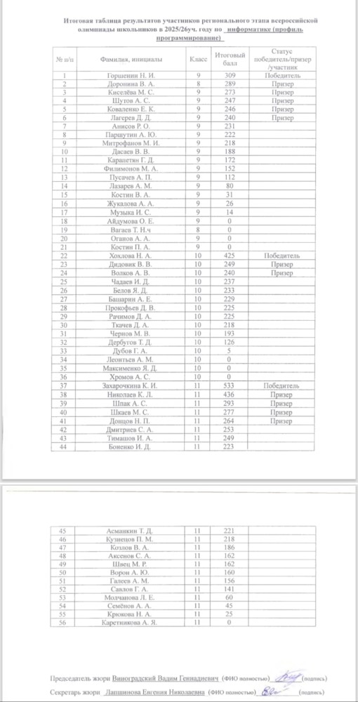 15 января 2026 года Александр представлял нашу школу в составе сборной г.Обнинска на региональном этапе Всероссийской олимпиады школьников по информатике (программирование) в г. Калуга. В ходе двухдневных испытаний Александр показал третий результат среди учащихся 10 классов области и стал призером регионального этапа ВСОШ.